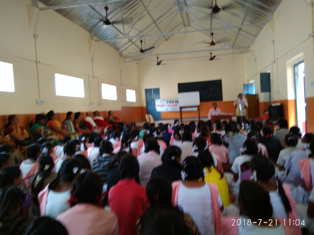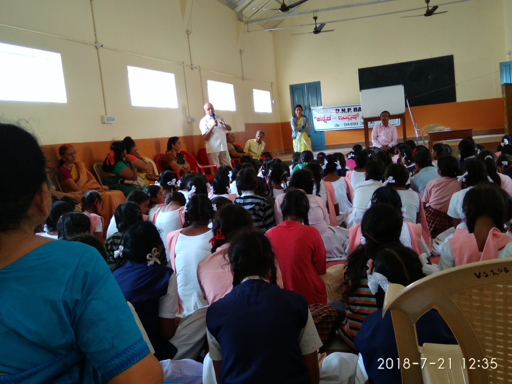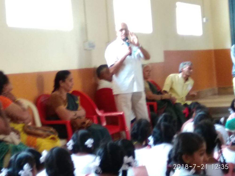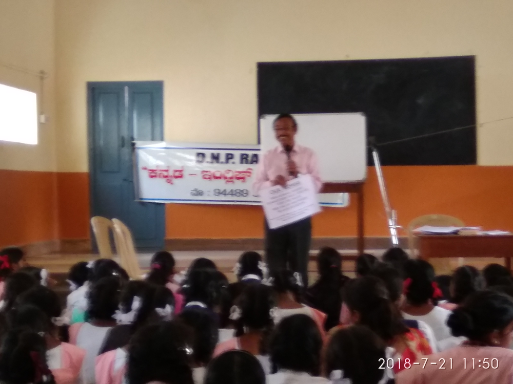 With a view to facilitate children of our school quickly pick up English sentences commonly used in our day to day life, a lecture by Sri D K. Puroshotham Rao was arranged at the school on 21 Jul from 1100 hrs to 1230 hrs. About 70 children studying in class 7-10 attended the talk. Sri Purushotham, a resource person with vast experience in teaching English told the children the importance of English in the present day world and how children can start conducting their routine conversations in English if they master 2000 English sentences. He presented several charts containing commonly used sentences in Kannada with English translation for use by the children. He advocated setting up an English lab in the school for teaching spoken English to our children. He offered his help to take this project forward.